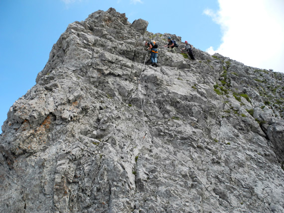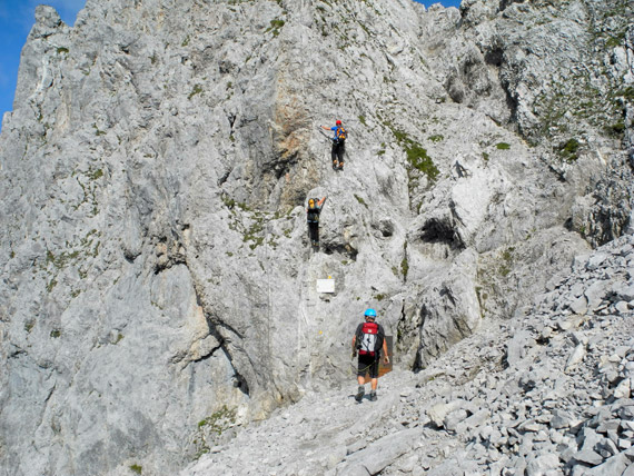 Der Einstieg in den Klettersteig war der erste Schockmoment. Bei den Bildern von den steilen Wänden im Wanderführer mit den Stahlbügeln dachte ich mir: das ist wie Leiter klettern. Der Erkenntnis kam recht schnell: ist es nicht! Man erreicht durchaus von einer Sprosse nicht unbedingt die nächste, die Bügel sind sehr klein und bieten wenig Stabilität und manchmal hören sie einfach auf, obwohl man immer noch in der senkrechten Wand hängt.
