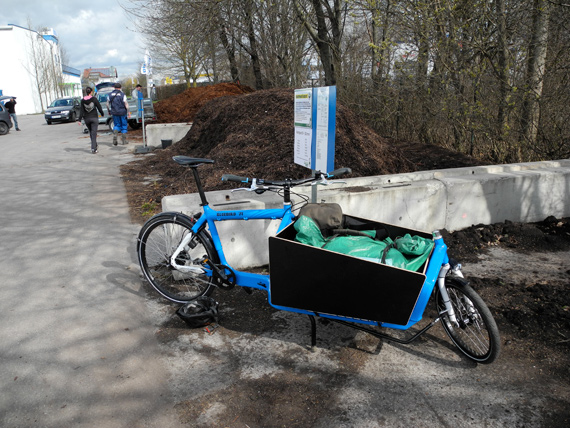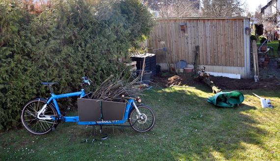 Nach Entsorgung des Geästs lud ich noch rund 100 Liter Kompost-Erde mit ein. Das ist dann gewichtstechnisch dann doch etwas über dem Limit des Rades.
